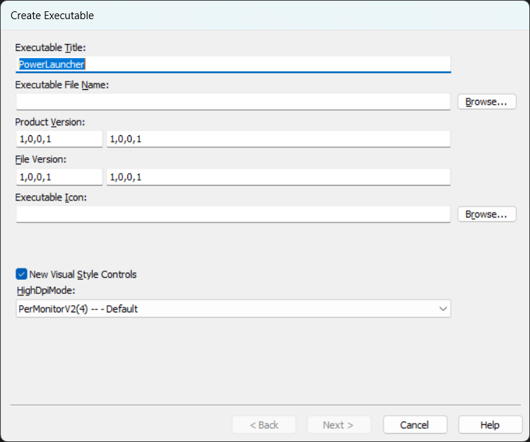 Click the Browse button next to the Executable Icon box to assign an icon to the executable file.