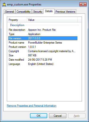 The values you specify become part of the Version resource associated with the executable file. The names you enter on the right display on the Version tab page of the Properties dialog box for the executable file in Windows Explorer. For example, the Properties dialog box for the executable file may look like this: