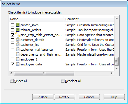 The Executable Items dialog box displays, listing all reports, forms, and pipelines you have selected for the executable file.