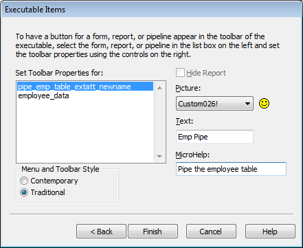 In the Executable Items dialog box, you can define the properties of a toolbar button for any of the items in the executable. Then in the application you can run the report, form, or pipeline by simply clicking the toolbar button.