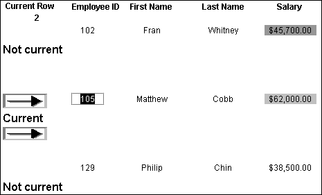 Notice that the number of the current row is 2; the first row and the third row are "Not current" (and therefore display no bitmap); and the second row, which is the current row, displays the arrow row indicator.