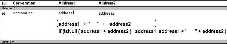 When you preview the report, if either Address1 or Address2 is null, no part of the address displays because the value of the expression is null. To display a part of the address, you need to create a computed field that forces evaluation even if Address2 is null. Note that Address2 is assumed to have data only if Address1 has data for a particular row.