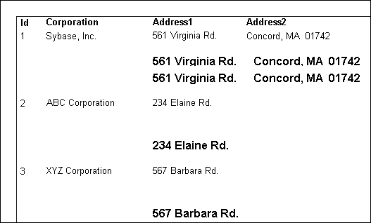 When you preview the report, notice that the first computed field displays null for ABC Corporation and XYZ Corporation. The second computed field displays the first part of the address, which is not null.