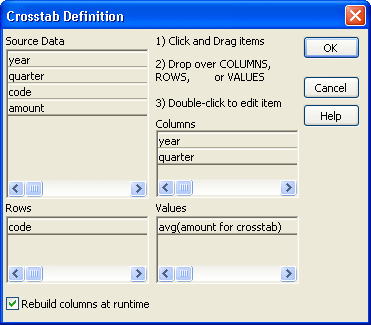 When you define a crosstab with more than one column, the order of the columns in the Columns box of the Crosstab Definition dialog box governs the way the columns are grouped. To end up with the most effective expressions, make the column that contains the grouping values (for example, year or department) the first column in the Columns box and the column that contains the values to be grouped (for example, quarter or employee) second.
