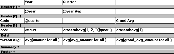 The value 2 refers to the quarter column (the second column in the Crosstab Definition dialog) and "@year" specifies grouping values from the year column (meaning the function will average values for the quarters within each year). The value 1 refers to the crosstab-values expression that will be averaged. In the resulting crosstab, the computed field repeats in each row after the cells for the quarters within each year.