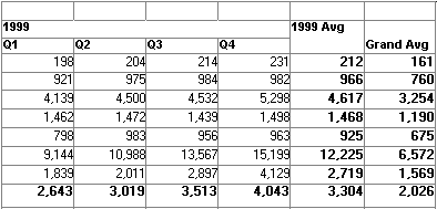 Each row in the crosstab (after adjusting the column widths) has cells for the amounts in the quarters, a repeating cell for the yearly average, and a grand average. The crosstab also displays averages of the amounts for all the financial codes in the quarters in the summary band at the bottom.