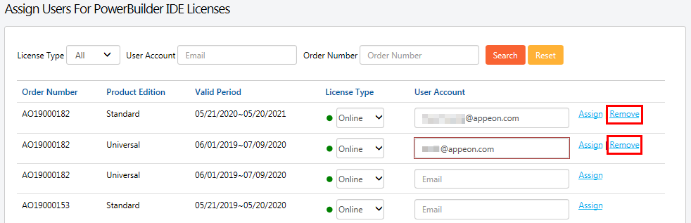 User accounts should be created first on the Appeon website and then licenses should be assigned to user accounts before the user can activate the product using the account. And the license administrator can neither assign one license to multiple user accounts nor assign multiple licenses to one user account within a given valid period.