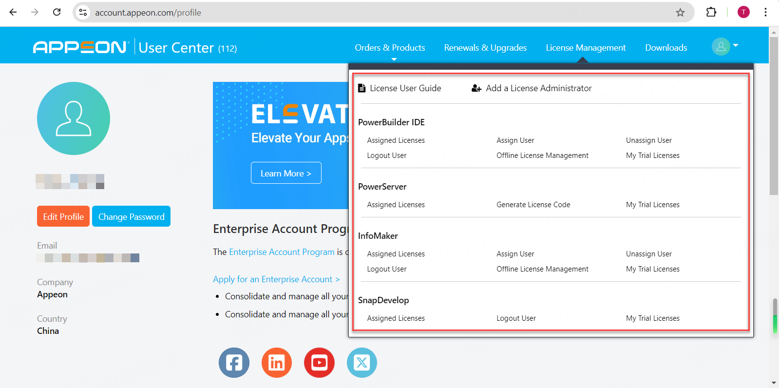 License Management on the Appeon website can manage all of your purchased licenses for the Appeon product.