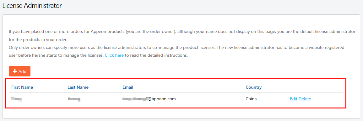 Note: If you purchase a product from the Appeon website, you automatically become a license administrator to the license you have purchased (you do not need to add it manually), and your account will not be listed; you may add others as license administrators to co-manage your licenses.