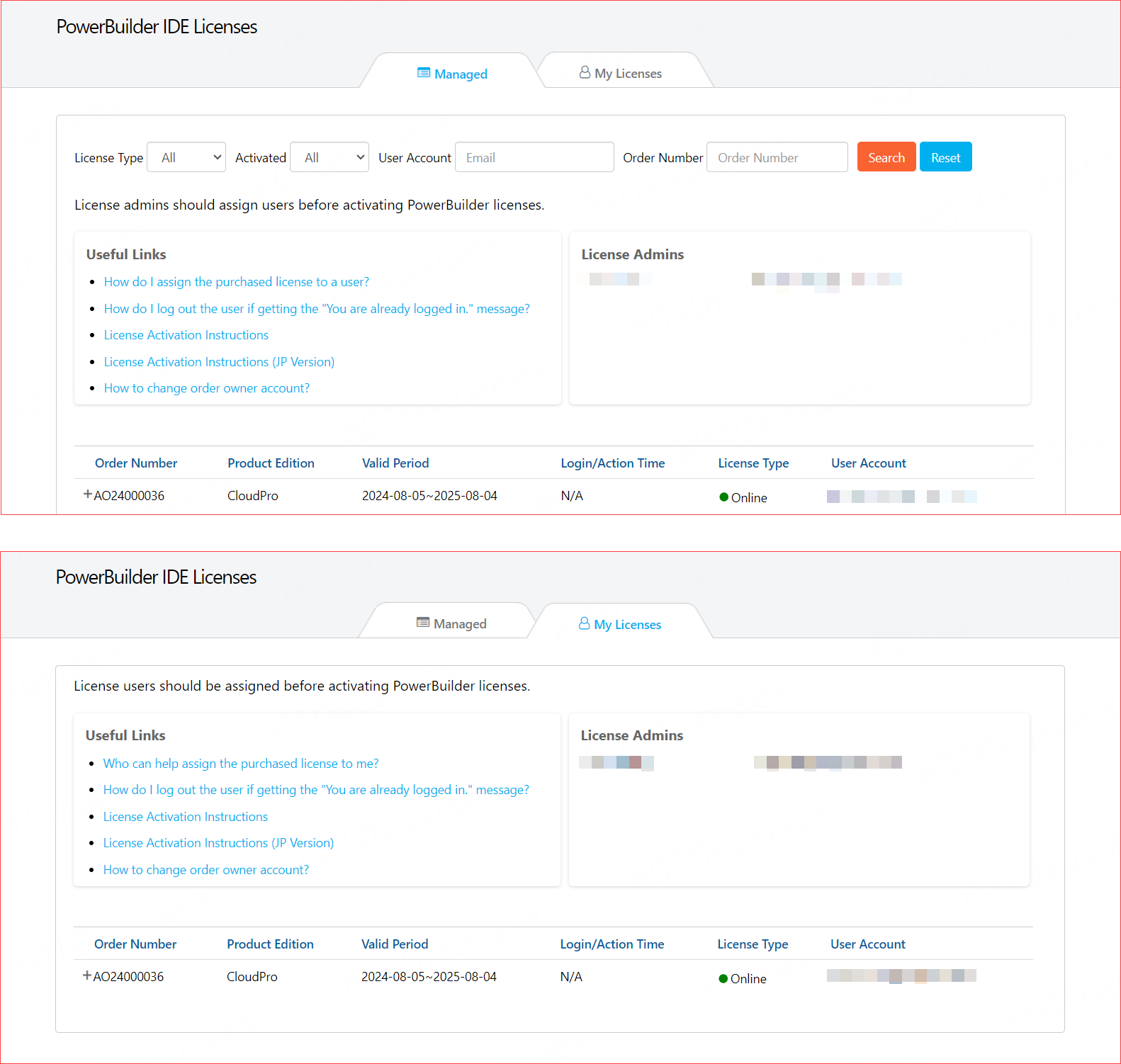 Click License Management in the User Center navigation bar, and then click Assigned Licenses under the PowerBuilder IDE section.