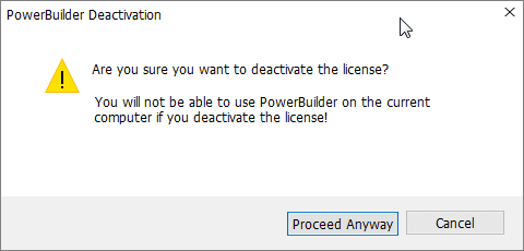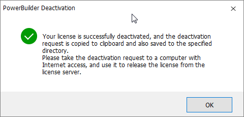 Click OK and then click Close to close the window. Although the offline license is deactivated from PowerBuilder, you should not stop here, because you should also deactivate the license from the Appeon license server so that the license is available for the subsequent use.