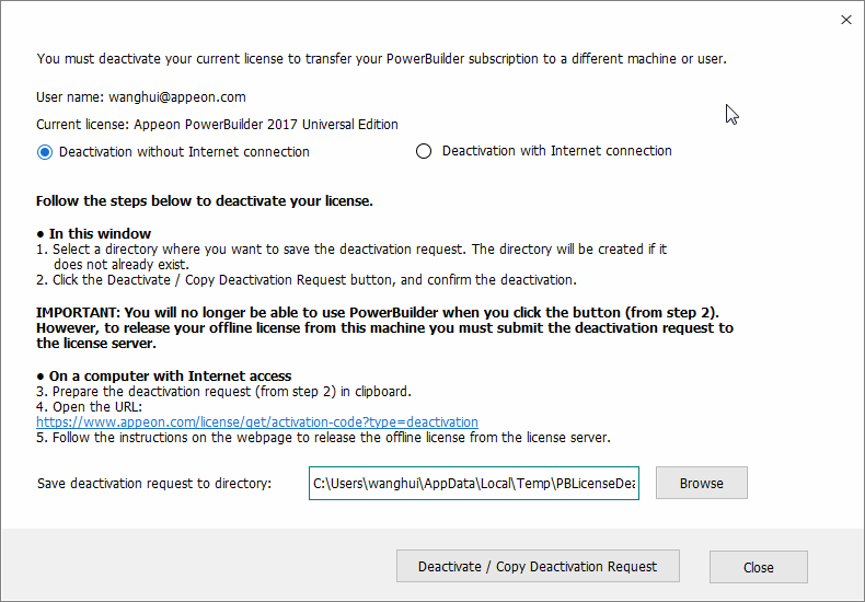 If you select Deactivation with Internet connection, make sure your current machine can access Internet, and the offline license will be deactivated by the Appeon license server immediately after you click Deactivate and confirm the deactivation in the dialog box.