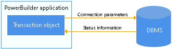 In a PowerBuilder database connection, a Transaction object is a special nonvisual object that functions as the communications area between a PowerBuilder application and the database. The Transaction object specifies the parameters that PowerBuilder uses to connect to a database. You must establish the Transaction object before you can access the database from your application, as shown in the following figure:
