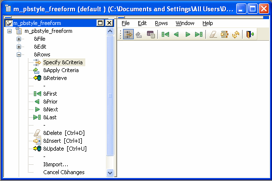 The menu named m_pbstyle_freeform provides the menu items and toolbar items available to users when they run forms based on the Freeform style.