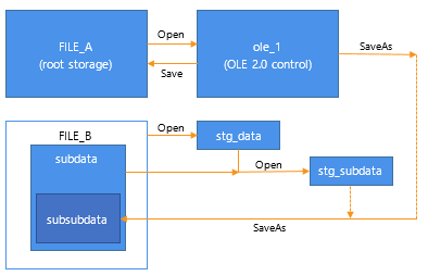 ole_1.SaveAs(stg_subdata, "subsubdata")The diagram illustrates how to open the nested storages so that you can perform the SaveAs. If any of the files or storages do not exist, Open and SaveAs create them. Note that if you call Save for the control before you call SaveAs, the control's object is saved in FILE_A. After calling SaveAs, subsequent calls to Save save the object in subsubdata in FILE_B.