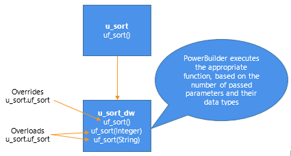 In function overloading, the descendant function (or an identically named function in the same object) has different arguments or argument datatypes. PowerBuilder determines which version of a function to execute, based on the arguments and argument datatypes specified in the function call: