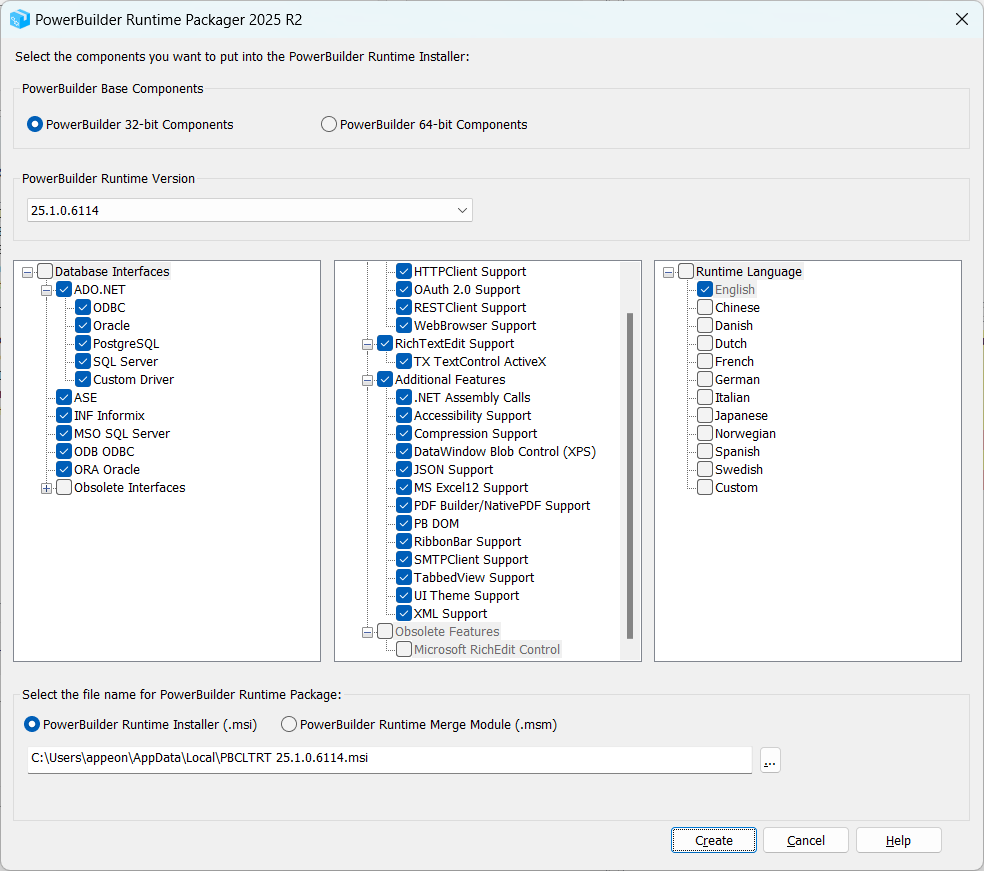 PowerBuilder components (Default file name for runtime package is PBCLTRT.msi)