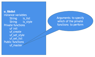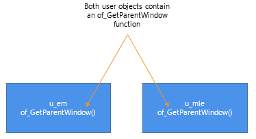 Another example of using inheritance in custom class user objects is creating an ancestor object containing functions for all platforms and then creating descendant objects that perform platform-specific functions. In this case, the ancestor object contains a virtual function (uf_change_dir in this example) so that developers can create descendant objects using the ancestor's datatype.
