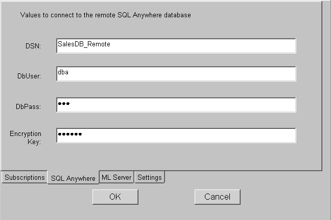 The default synchronization options window has four tab pages: Subscriptions, SQL Anywhere, MobiLink Server, and Settings.