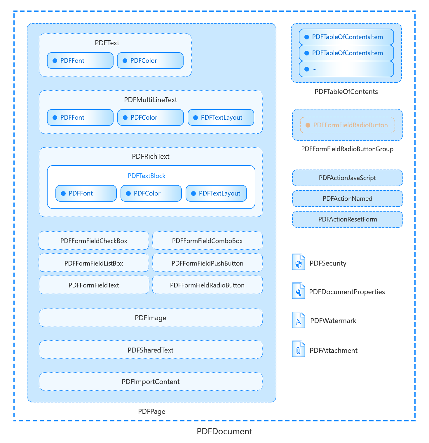 Each PDFDocument object stands for a PDF document. The following diagram shows the makeup of a PDF document: