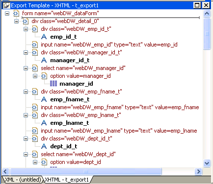 In the default XHTML export template, export XHTML entities (markup and character data) are displayed as single tree view items that denote the type of entity. The default template has one element for each column in the DataWindow object: