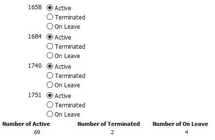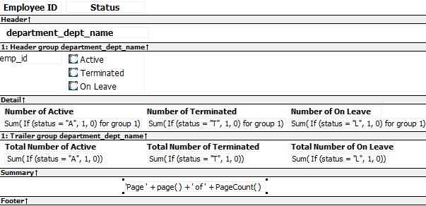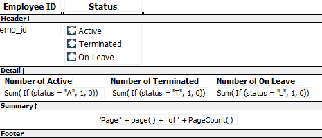 Here is the last page of the DataWindow object, with the total number of active employees, terminated employees, and on leave employees in the company displayed.