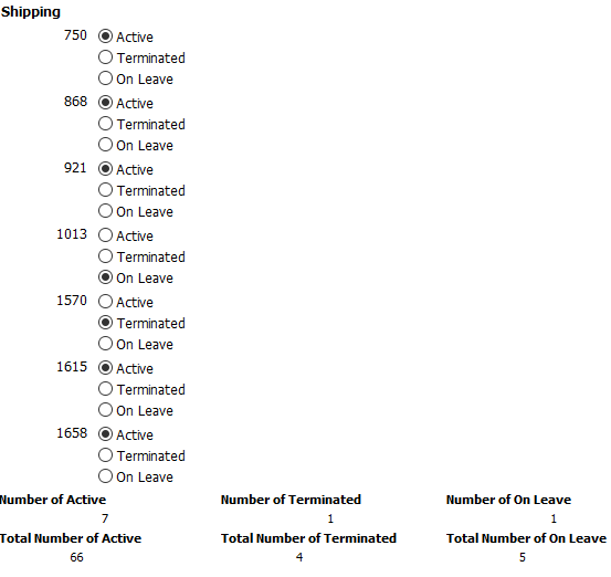 Here is the last page of the DataWindow object with the number of active employees, terminated employees, and on leave employees in the shipping department displayed, followed by the total number of active employees, terminated employees, and on leave employees in the company.