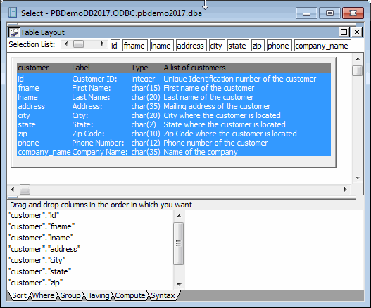 This DataWindow retrieves all columns for the Customer table. It is useful as a detail DataWindow.