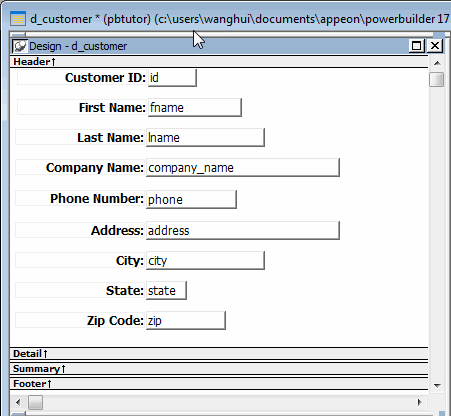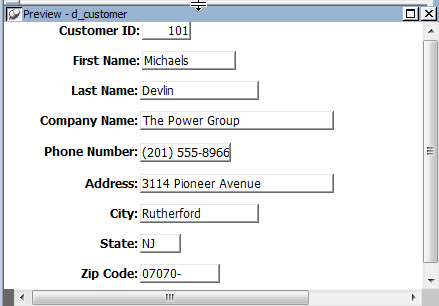 If you want to preview the record for another customer, you can right-click inside the DataWindow Preview view, select Retrieve from the pop-up menu, then specify a different customer ID in the Specify Retrieval Arguments dialog box.