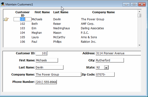 The phone number and zip code use edit masks to display the information you type. You must enter numbers only for these data fields. To specify the state in which the customer resides, you must click the arrow next to the state column and select an entry from the drop-down list box.
