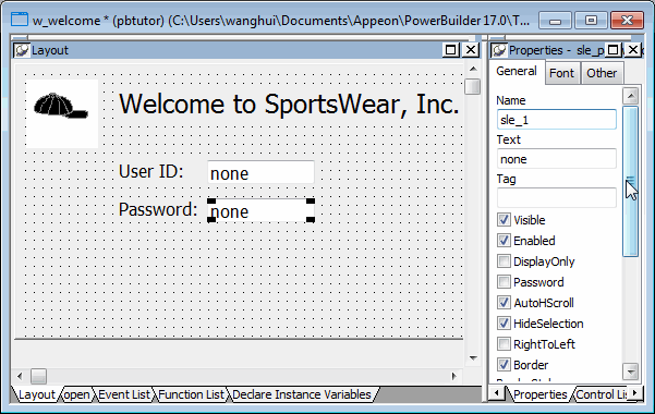 Now you define the properties of the SingleLineEdit controls you just added to the login window.
