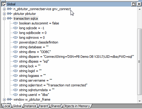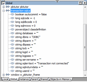 As you step through each statement, you can check that the values you entered in the login window are being assigned to the Transaction object. You are still not connected to the database until the connection service object of_Connect function is executed.