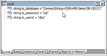 You step out of the Constructor event in a single step and return to the script for the OK button Clicked event. Now the value of sqlcode has changed, and the sqlerrortext and DBMS property have values, but the UserID, DBPass, and DBParm properties do not.
