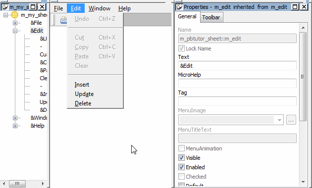 Next you add items to the Edit menu of the menu you just inherited from m_pbtutor_sheet. You use the WYSIWYG and Properties views.
