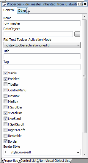Now you add a DataWindow control (saved as the user object, u_dwstandard) to the w_master_detail_ancestor window. It serves as the master DataWindow for the ancestor window and its descendants.
