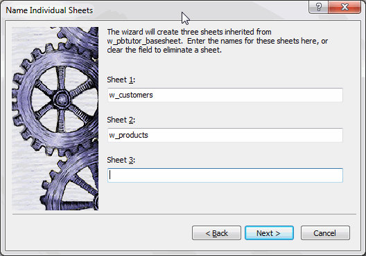 On the Name Individual Sheets page, type w_customers for Sheet 1, w_products for Sheet 2, and clear the Sheet 3 text box.