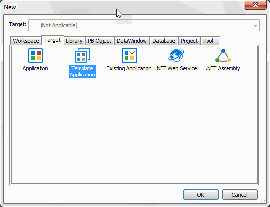 Now you create a new target using the Template Application wizard. Based on the choices you make, the Template Application wizard creates precoded events, menus, windows, and user objects in addition to the application object.