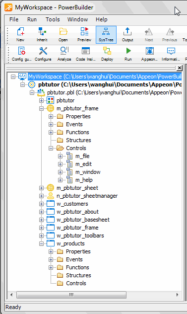 You can expand the System Tree to view all the objects that have been created by the Template Application wizard. The System Tree does not display the file extension of the pbtutor target, but it does display the directory where the target file is saved.