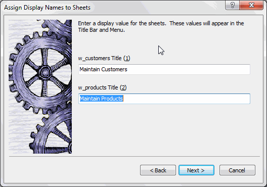 In this tutorial you accept the default application type, library search path, frame and frame menu names, sheet menu and manager service, and MDI base sheet.