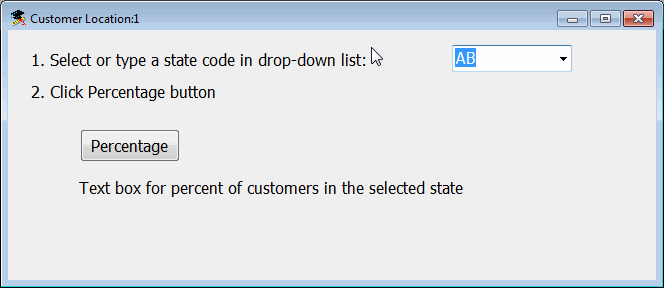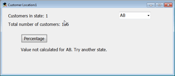 The text in the static text boxes now displays the number of customers in Alberta and the total number of customers in the database. The text in the editable text box tells you the value was not calculated and prompts you to select another state.