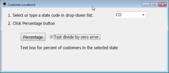 The division by zero error is thrown during the percentage calculation and caught by the button Clicked event. The message box that you coded in the CATCH clause for this error displays.
