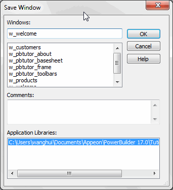 The Save Window dialog box displays. The only library in the Application Libraries text box is pbtutor.pbl, and it is selected.