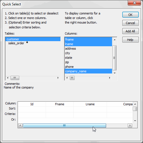 PowerBuilder displays the selected columns in a grid at the bottom of the Quick Select dialog box.