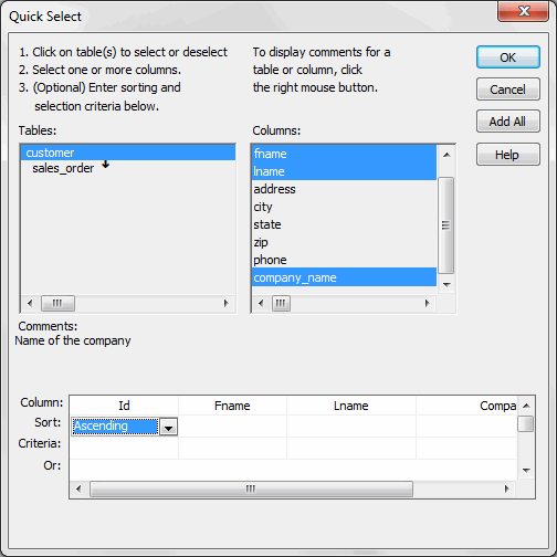 You can use the grid area at the bottom of the dialog box to specify sort criteria (for the SQL ORDER BY clause) and selection criteria (for the SQL WHERE clause). Now you specify sort criteria only. You sort the id column in ascending order.