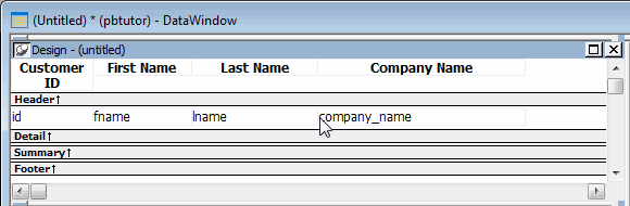 In the Design view, PowerBuilder displays a Header band with default headings and a Detail band with the columns you selected: