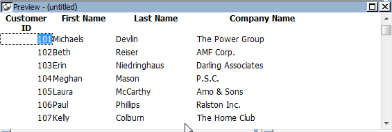 The Preview view displays the DataWindow as it appears during execution. PowerBuilder displays data for all customers. The data is sorted in ascending order by customer ID, just as you specified.