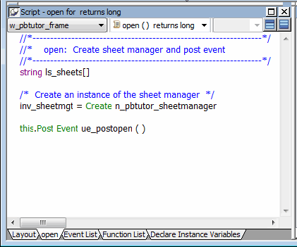 The frame window Open event already has a script associated with it that was generated by the Template Application wizard. The script creates an instance of a wizard-generated user object that serves as a sheet (window) manager. The Open script then calls the ue_postopen event.