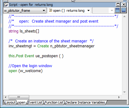 Now you add a one-line script to open the login window as soon as the application starts executing. Although you could change the script in the Application object Open event to open the login window, in this tutorial you make the call to open the login window from the Open event of the MDI frame window. This window (w_pbtutor_frame) was created by the Template Application wizard.