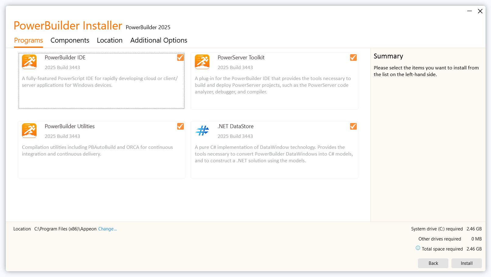 Select PowerBuilder IDE, PowerBuilder Utilities, and .NET DataStore from the Programs tab.