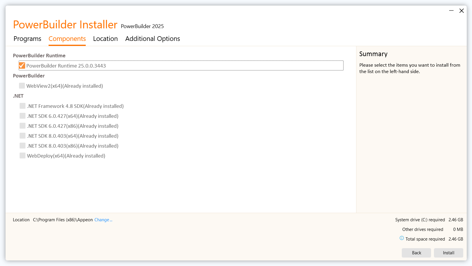 If no PowerBuilder Runtime has been installed on the machine before, then select to install PowerBuilder Runtime from the Components tab, as PowerBuilder IDE requires a runtime to start.